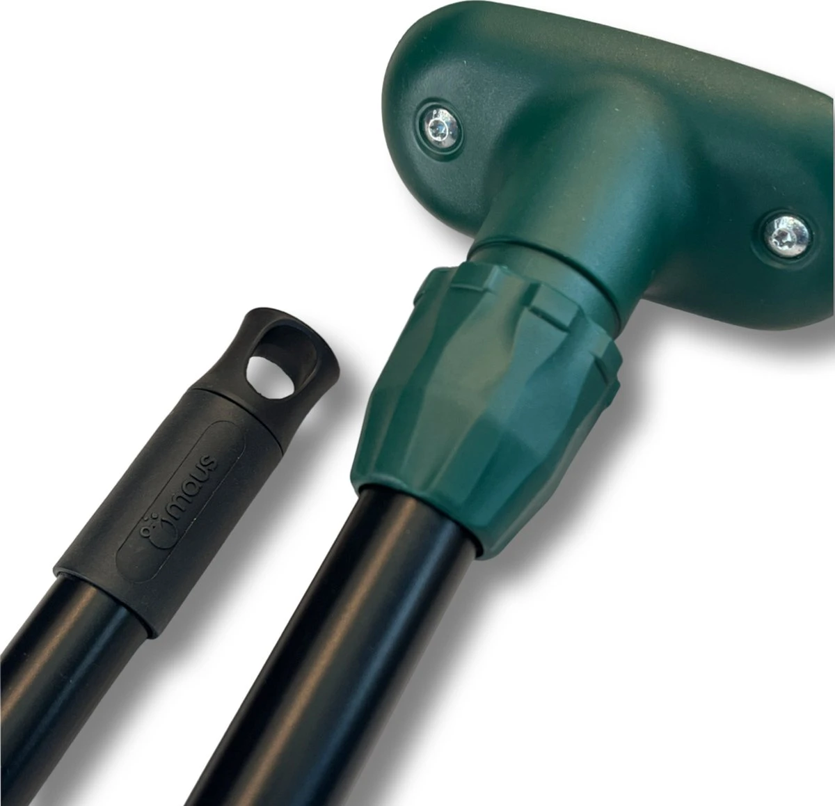 Ook de buik vol van bezems waarvan de steel steeds eruit valt? Dat is vanaf nu verleden tijd. Met deze MAUS set schroeft u de steel in de houder. Daarna draait u als extra vergrendeling de groene koppeling aan. Een gegarandeerd stevige verbinding. Ook de steel zelf is op stevigheid ontworpen van a-kwaliteit staal. Een steeldiameter van 24 milimeter maakt deze steel extreem robuust. De zwarte coating geeft de levensduur nog een extra boost. Door middel van het ophangoog hangt u het gereedschap na gebruik handig op.