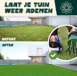 Door het gewicht van een grasmaaier, standbeeld of persoon kan de grond op bepaalde plekken dichtslaan. Met deze grasbeluchtingsschoenen belucht je snel en eenvoudig je gazon, zodat de gezondheid ervan stijgt!
